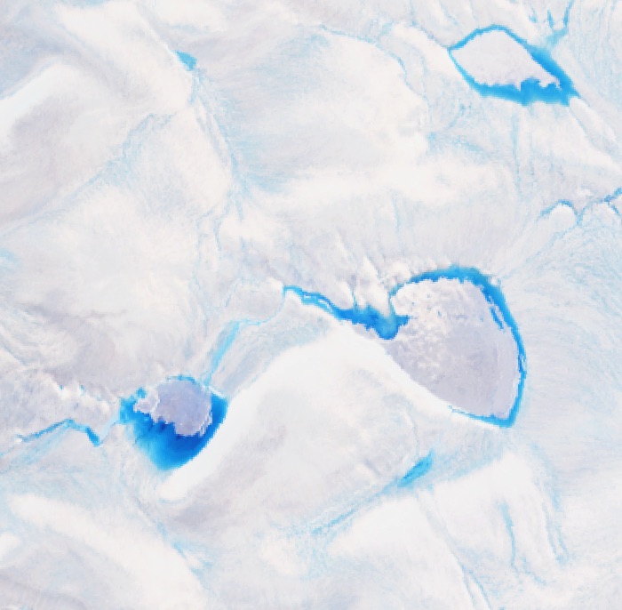 The background satellite photo shows three of these lakes at 1600 meters elevation — a colder area relatively high on the ice sheet where, before about 1990, there was minimal melt and lakes were not observed. This July 2014 photo shows that lakes are now forming in this area. However, these lakes have an interesting feature: they are covered in ice. The ice caps indicate that these lakes spent the winter on the ice sheet — in other words, they hold water from last summer that failed to escape to the bottom of the ice sheet by hydrofracture. This photo is broadly representative of higher-elevation lakes across much of the ice sheet. In short, supraglacial lakes are forming at high elevations, but the evidence suggests that they do not form hydrofractures. Why are these lakes different?