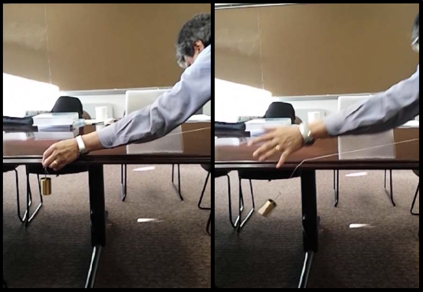 Up to this point, the physics is fairly intuitive, or at least believable. The scientists then carefully did the calculations representing the theory of what is happening when the weights fall off the table. The calculations were based upon the weights, the shape of the table, the incline of the table, the friction of the string with the table, and the swaying that the weights would naturally do as they moved off the table.